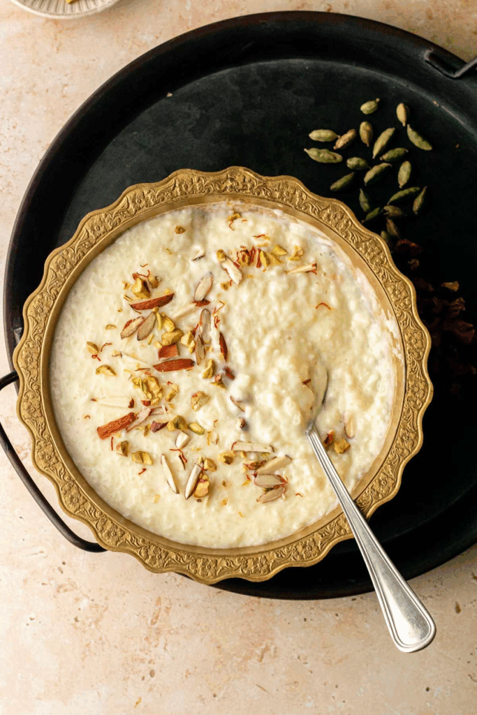 - In a bronze thali or earthen bowl (if available), pour warm kheer.