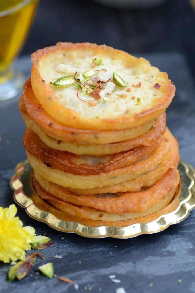 - Mix wheat flour, sugar/jaggery syrup, fennel seeds, and water/milk into a thick pouring batter.
